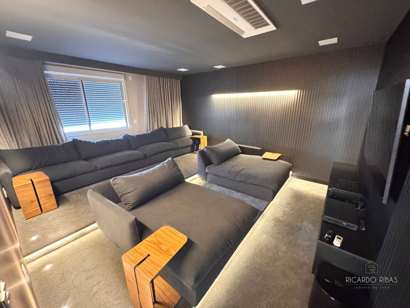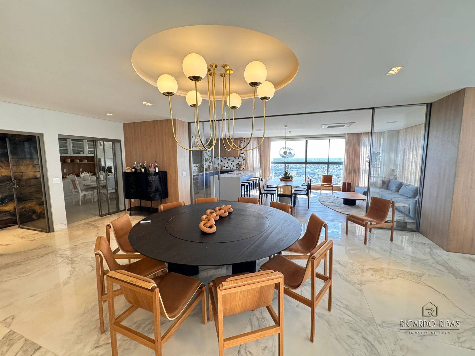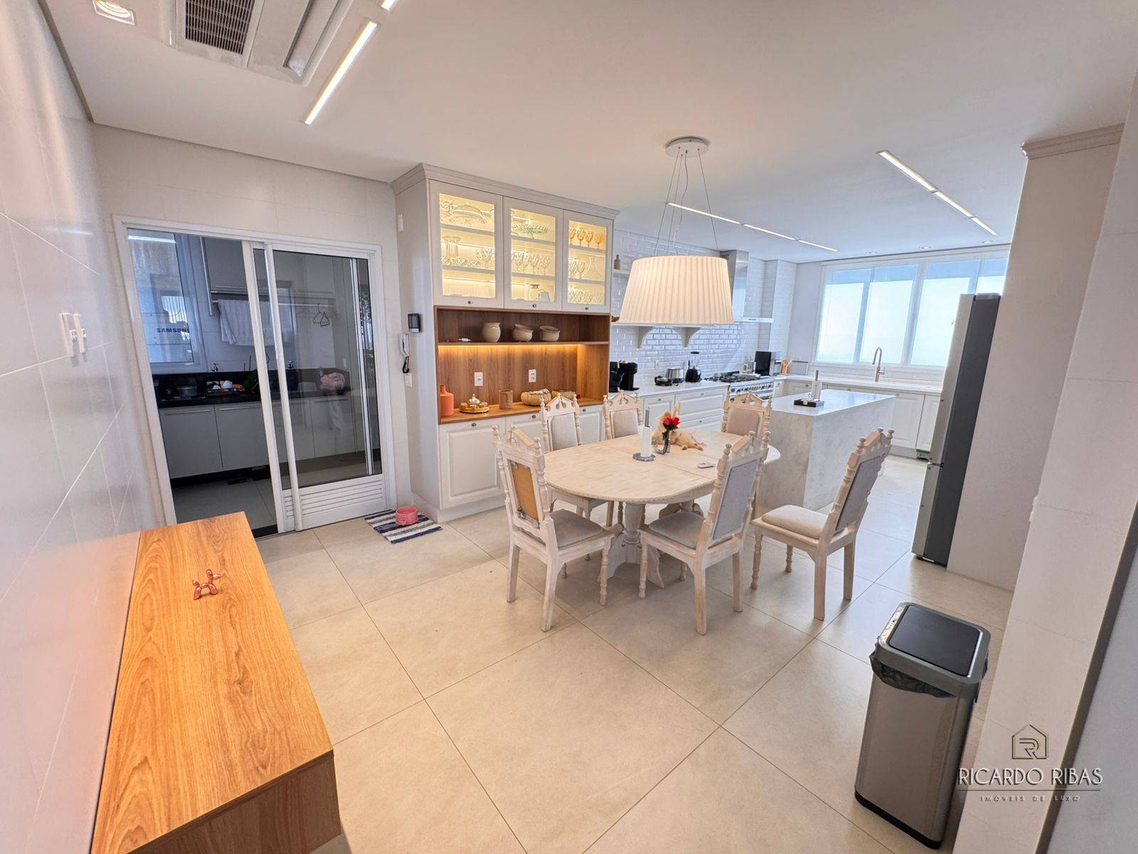 Ampla sala dividida em 3 ambientes, adega, espaço gourmet com churrasqueira a gás, fogão, tv e churrasqueira
