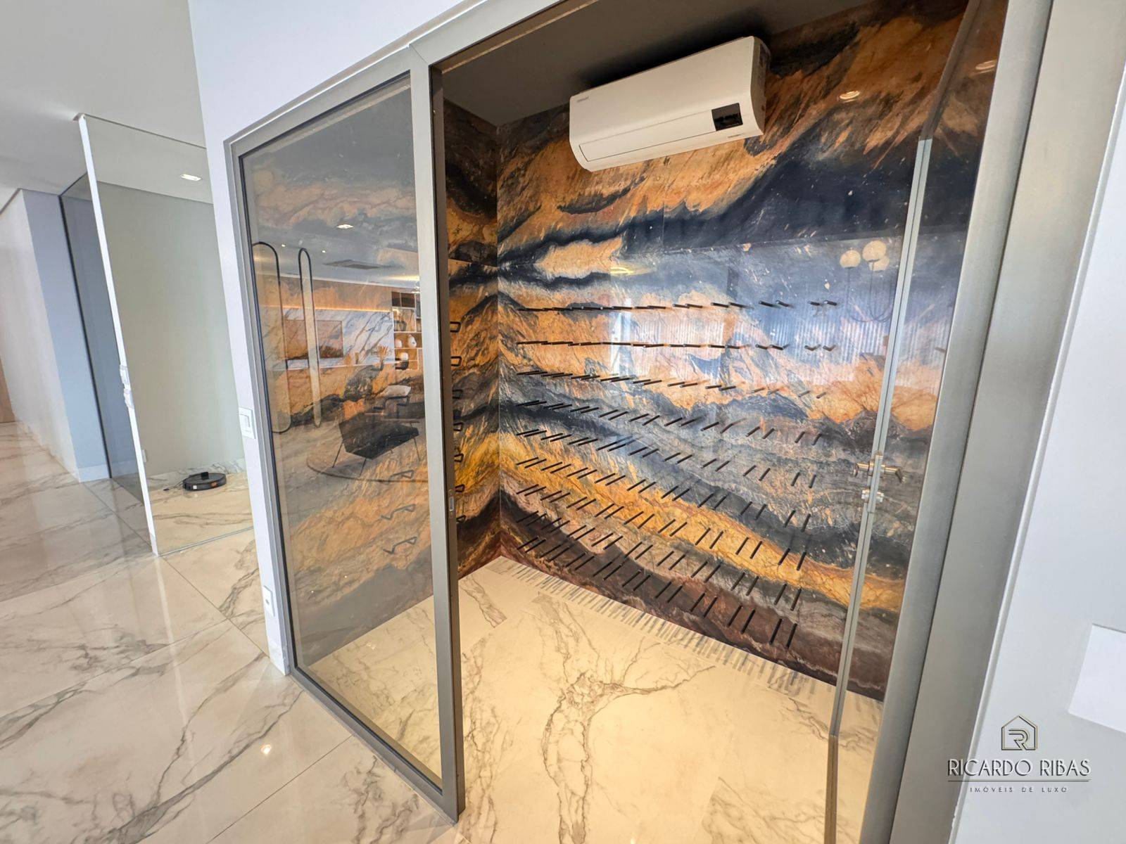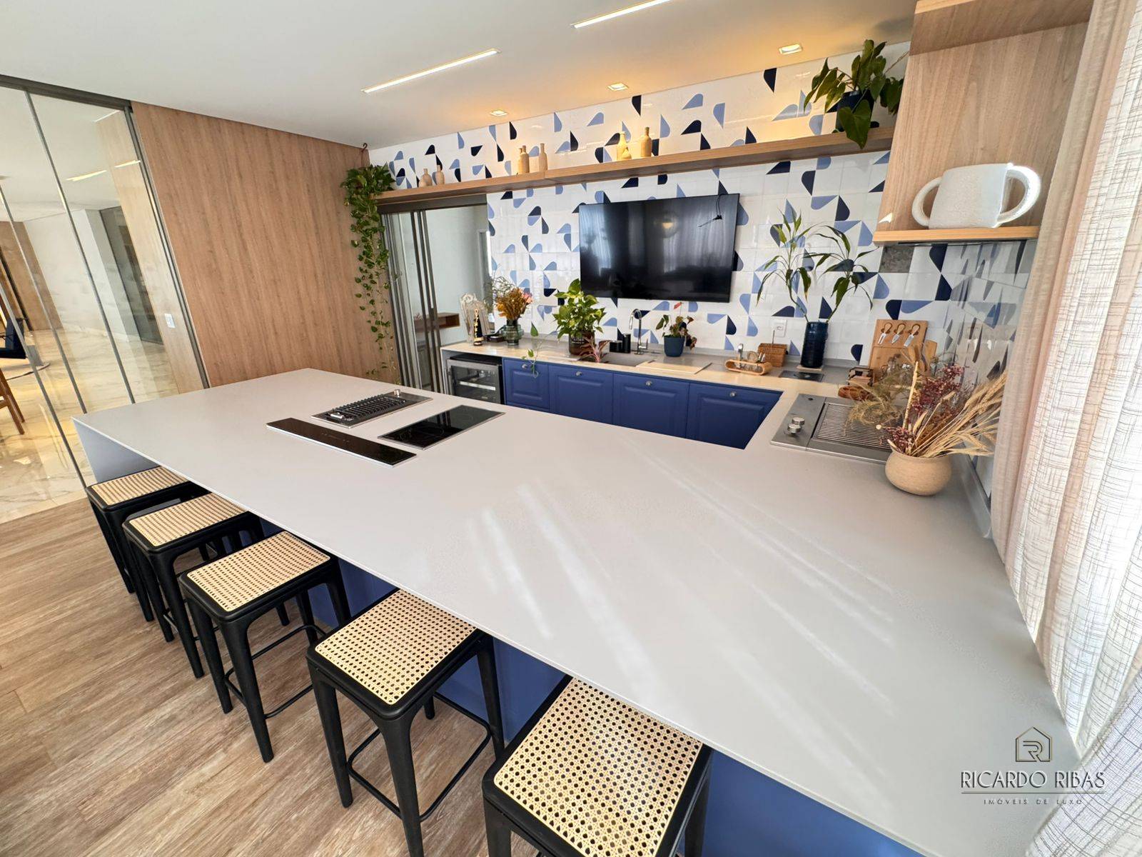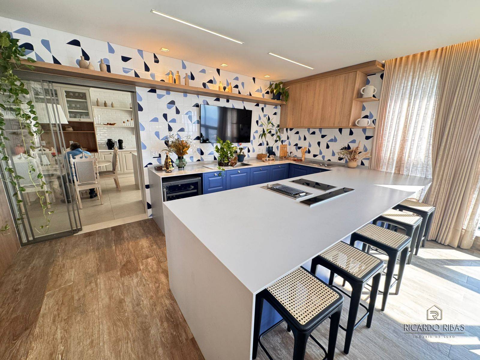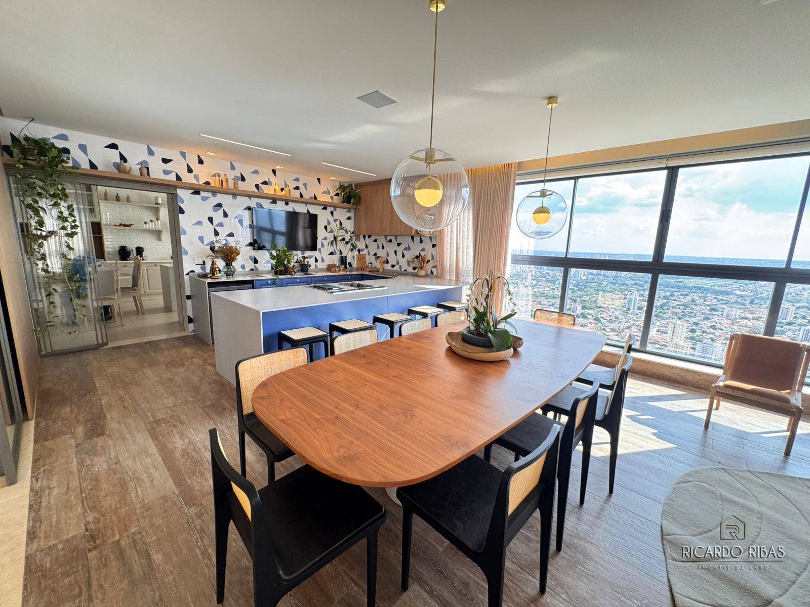 Ampla sala dividida em 3 ambientes, adega, espaço gourmet com churrasqueira a gás, fogão, tv e churrasqueira