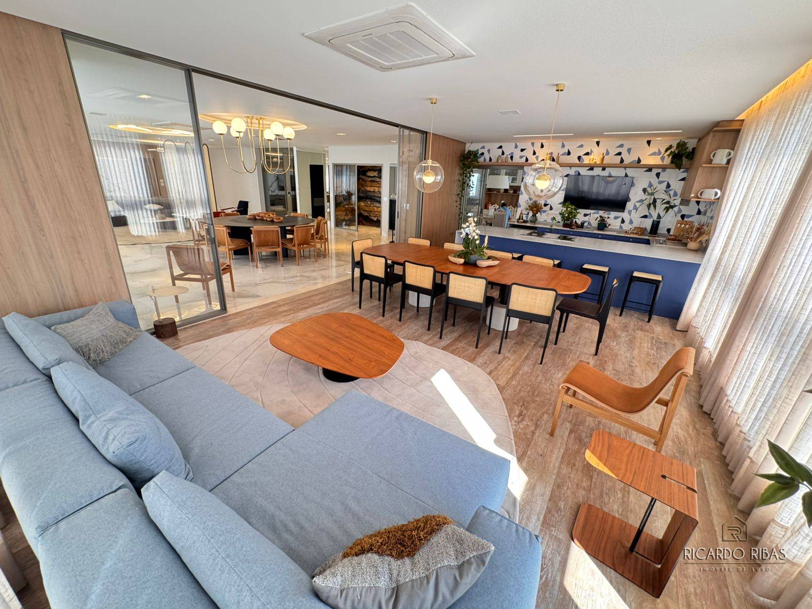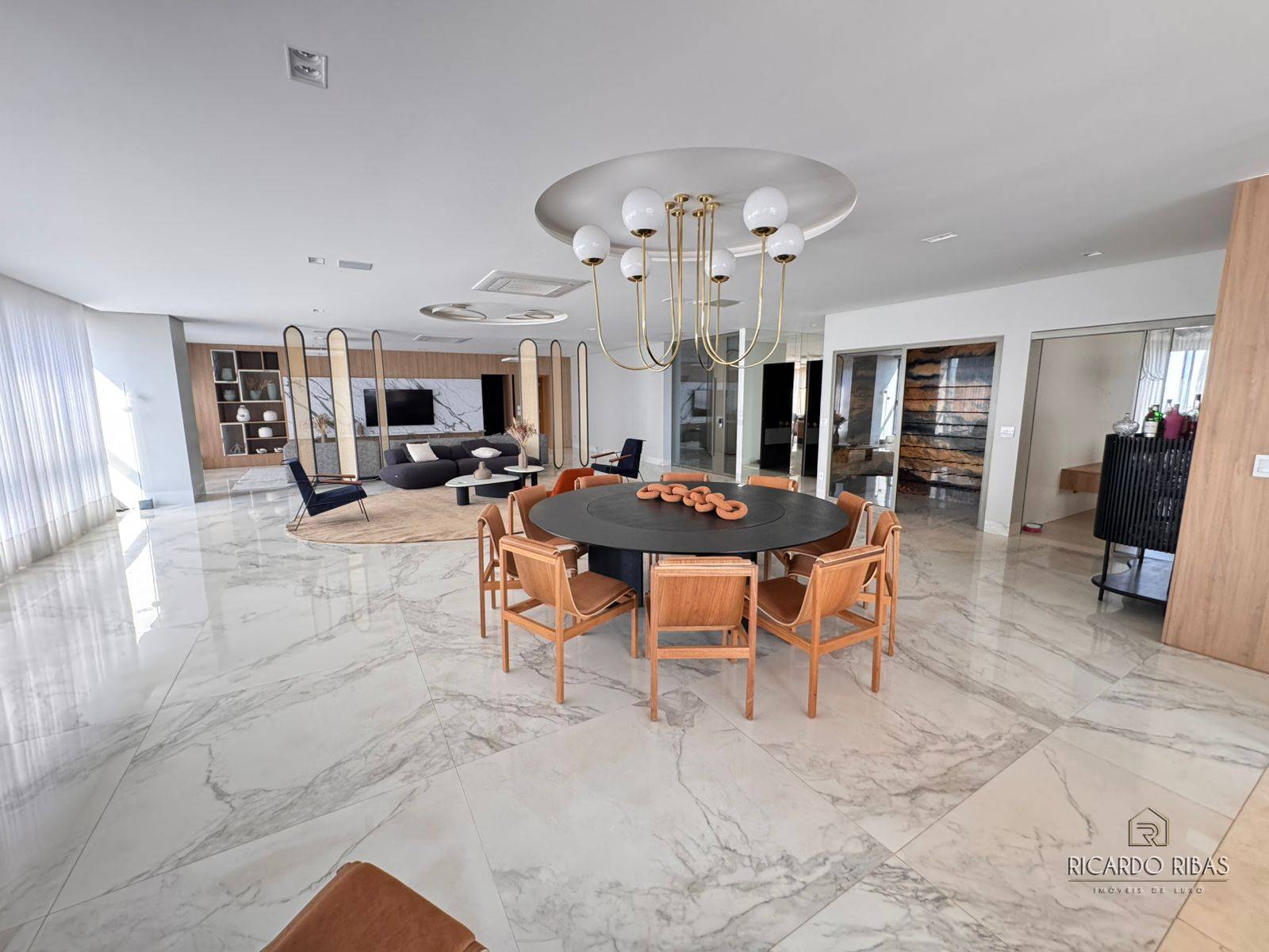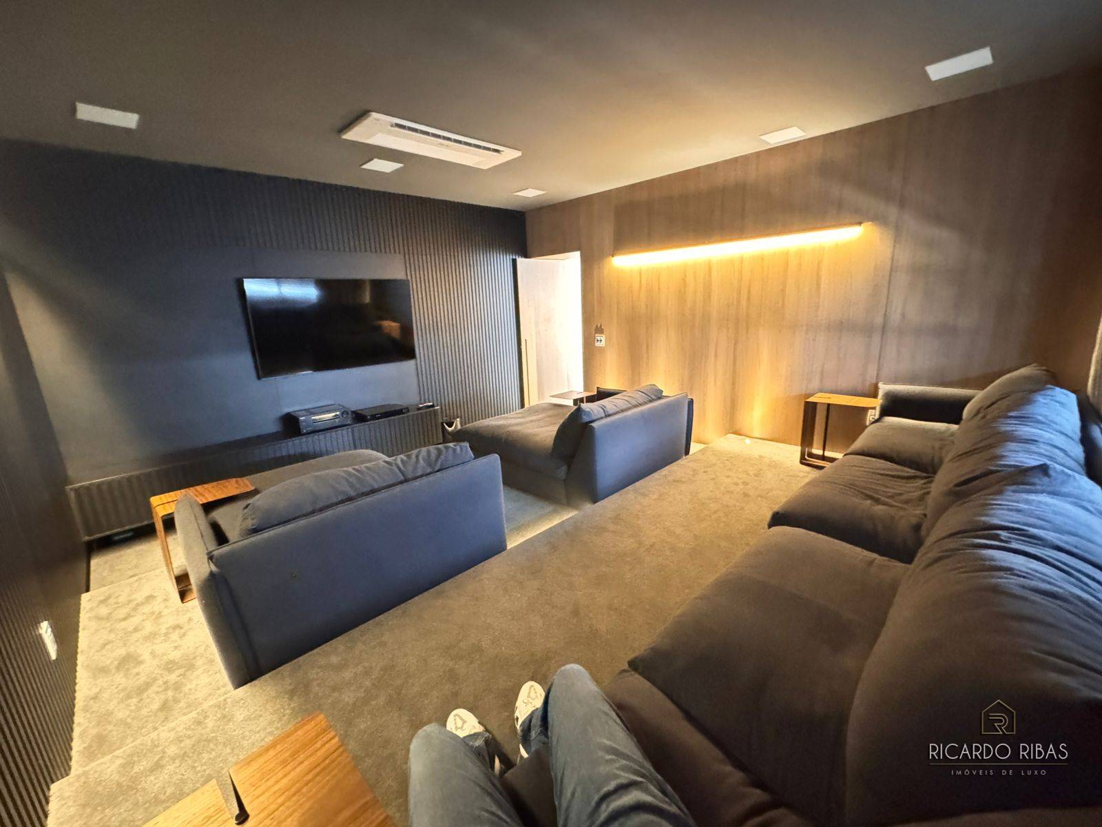 Ampla sala dividida em 3 ambientes, adega, espaço gourmet com churrasqueira a gás, fogão, tv e churrasqueira