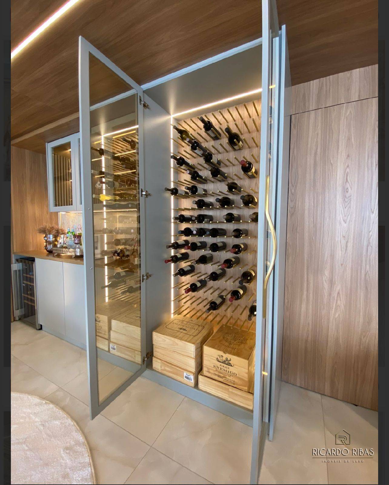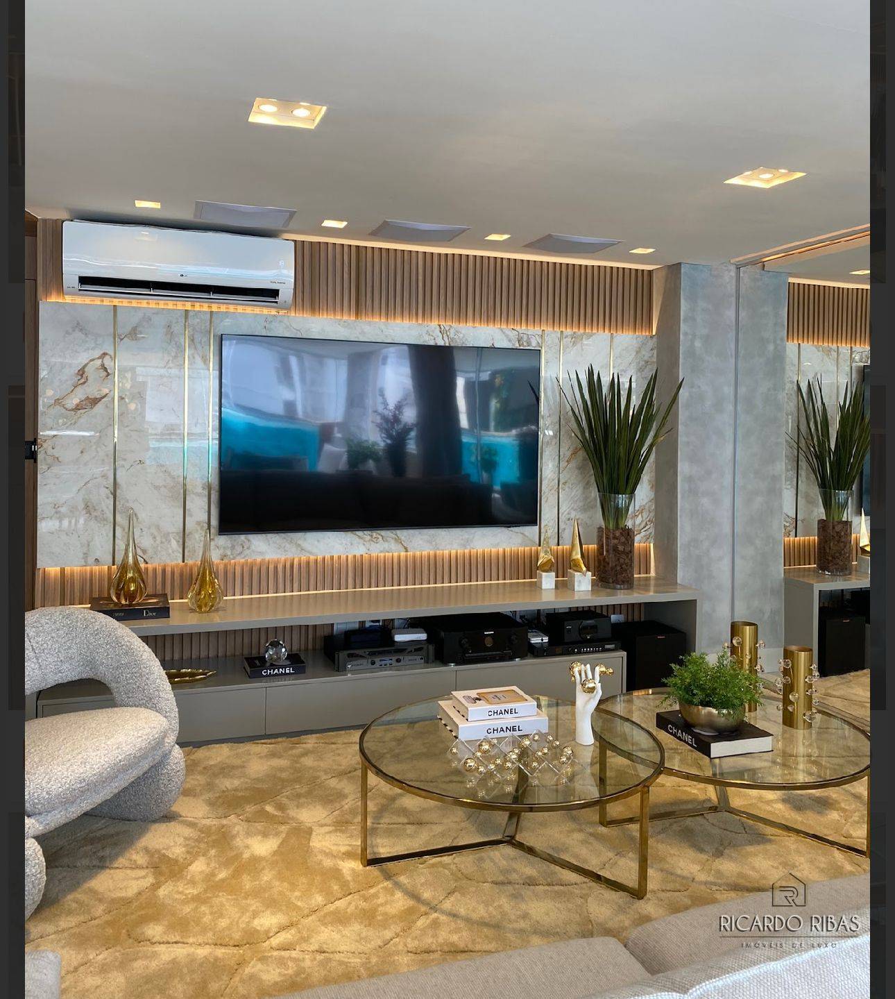 Repleta em armários, equipamentos eletrônicos e decoração