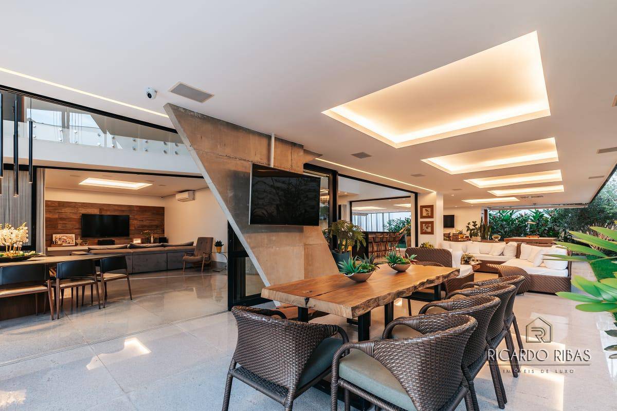 Sala de jantar com pé direito duplo e iluminação natural,
